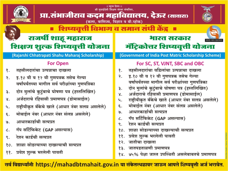 • As per the Government Resolution EBC/2009/122/MVK-03 dated 11 Jan. 2010, the e-Scholarship facility has come into force. It is mandatory for students availing Scholarship to open a Bank Account in any Nationalized Bank at the time of admission.